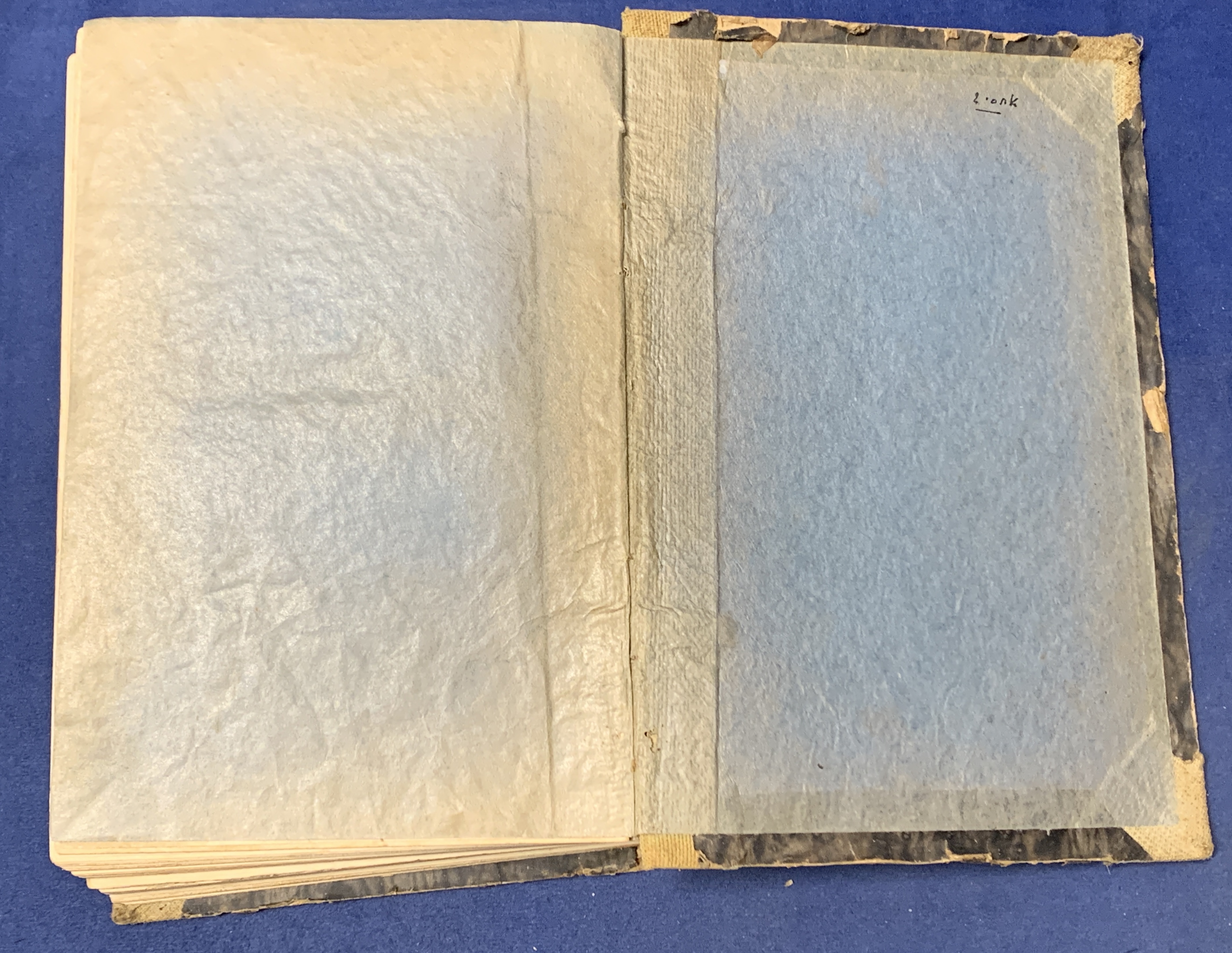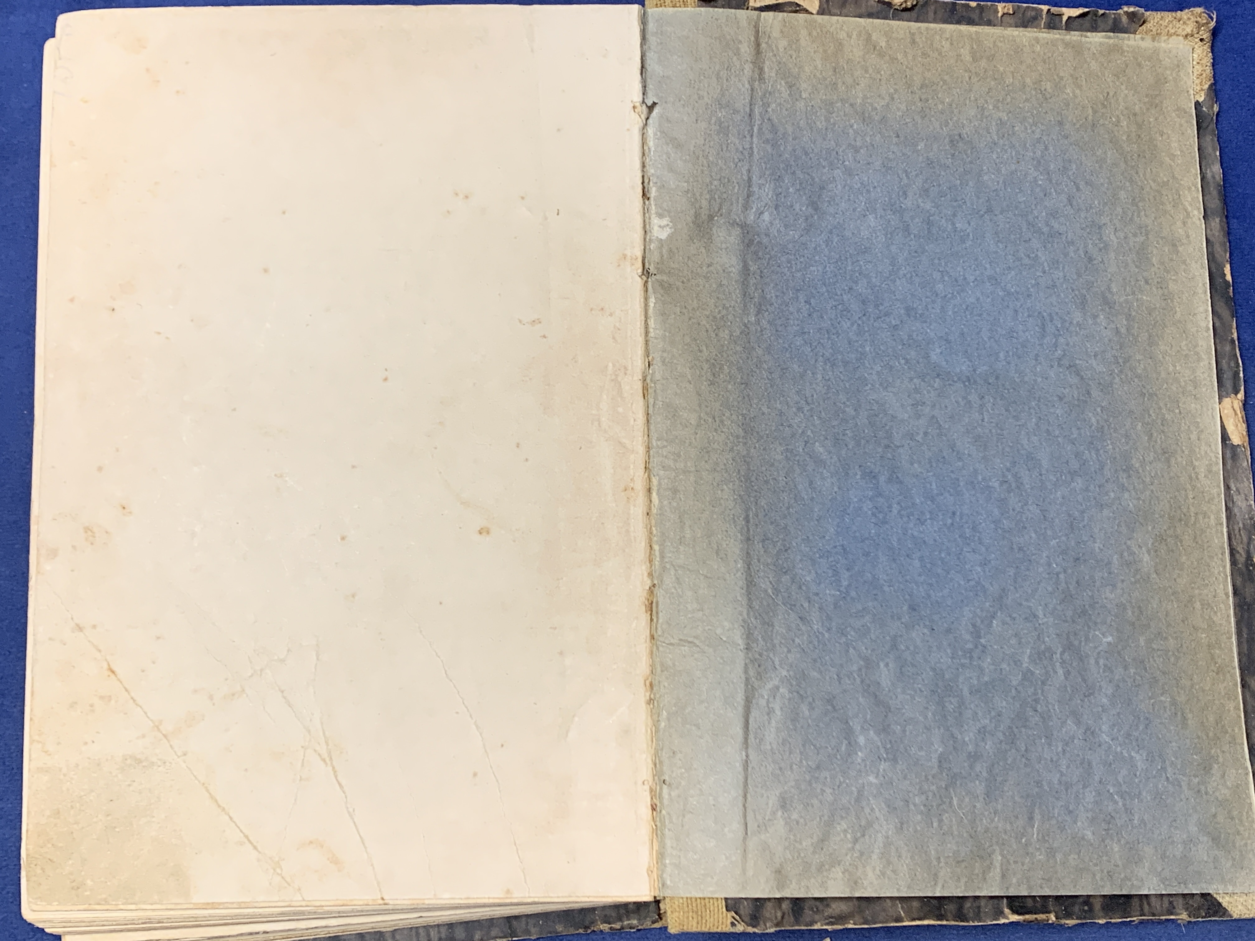 Interior: Inner hinges are reinforced with tape. Pages exhibit age-toning, occasional staining, and institutional library stamps on the title and opening pages.