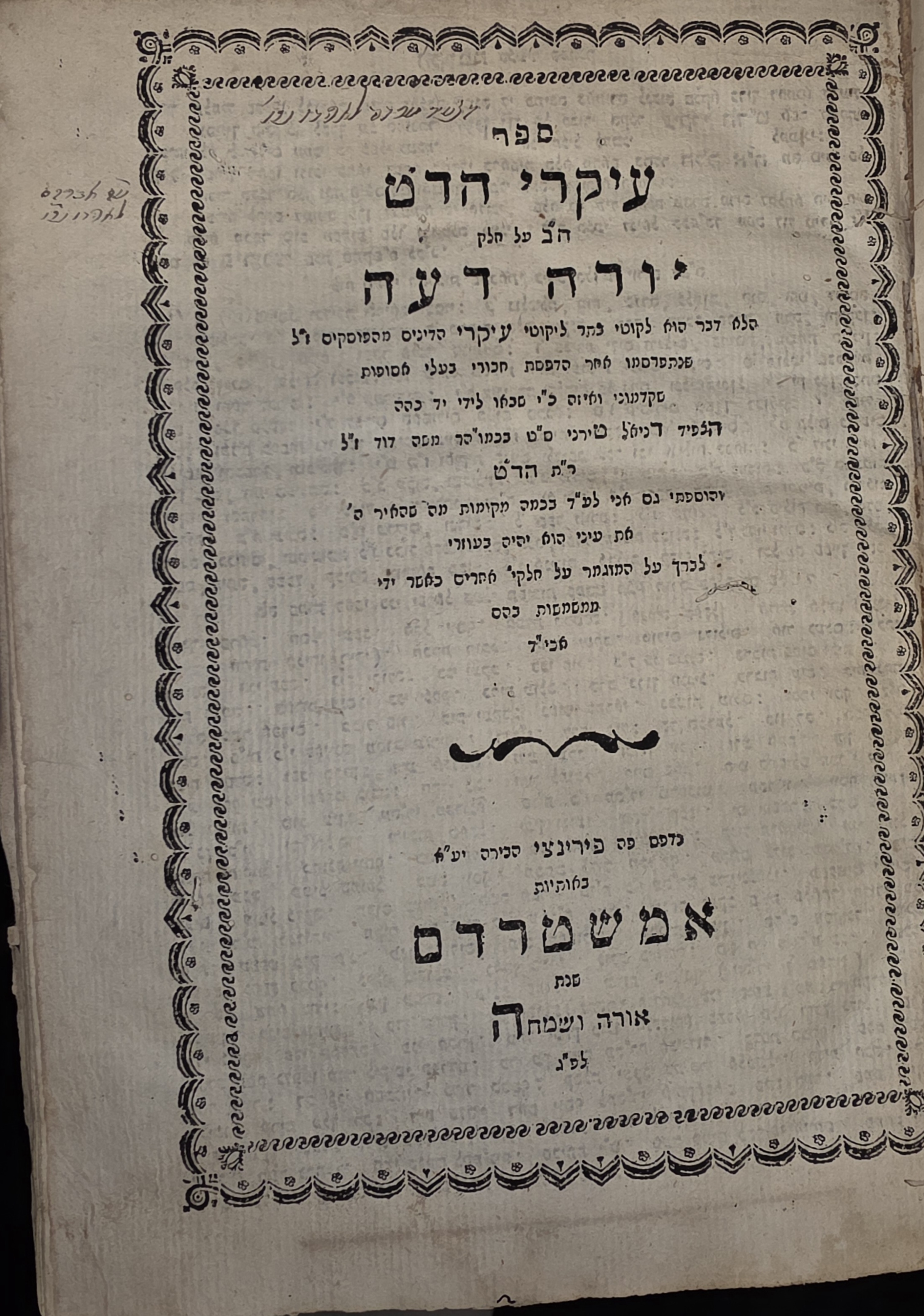 Rabbi Daniel Tirni רבי דניאל טירני Rabbi Daniel Tirni was one of the most distinguished Italian halakhists of the late 18th century, serving as the Chief Rabbi of Florence. His magnum opus, Ikkarei HaDat (עיקרי הד"ט), is a monumental work that provides a concise and systematic digest of the Shulchan Aruch (שולחן ערוך). Tirni was renowned for his ability to synthesize centuries of complex rabbinic rulings into a clear, authoritative guide, making this work a staple in the libraries of Dayanim (judges) and scholars across Europe and North Africa. This specific edition was printed in Tirni’s own city of Florence, ensuring the highest level of textual accuracy.