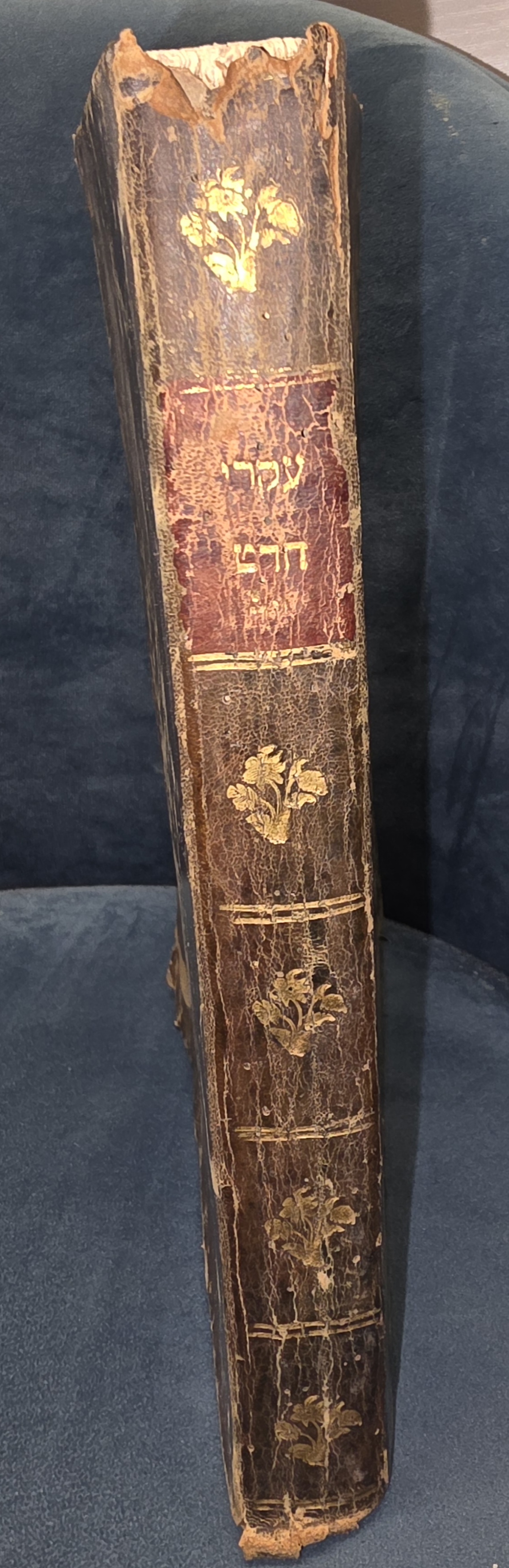 Spine is beautifully adorned with ornate gold-tooled floral stamps and a red leather title label with "Ikkarei HaDat" (עיקרי הד"ט) in brilliant gilt.