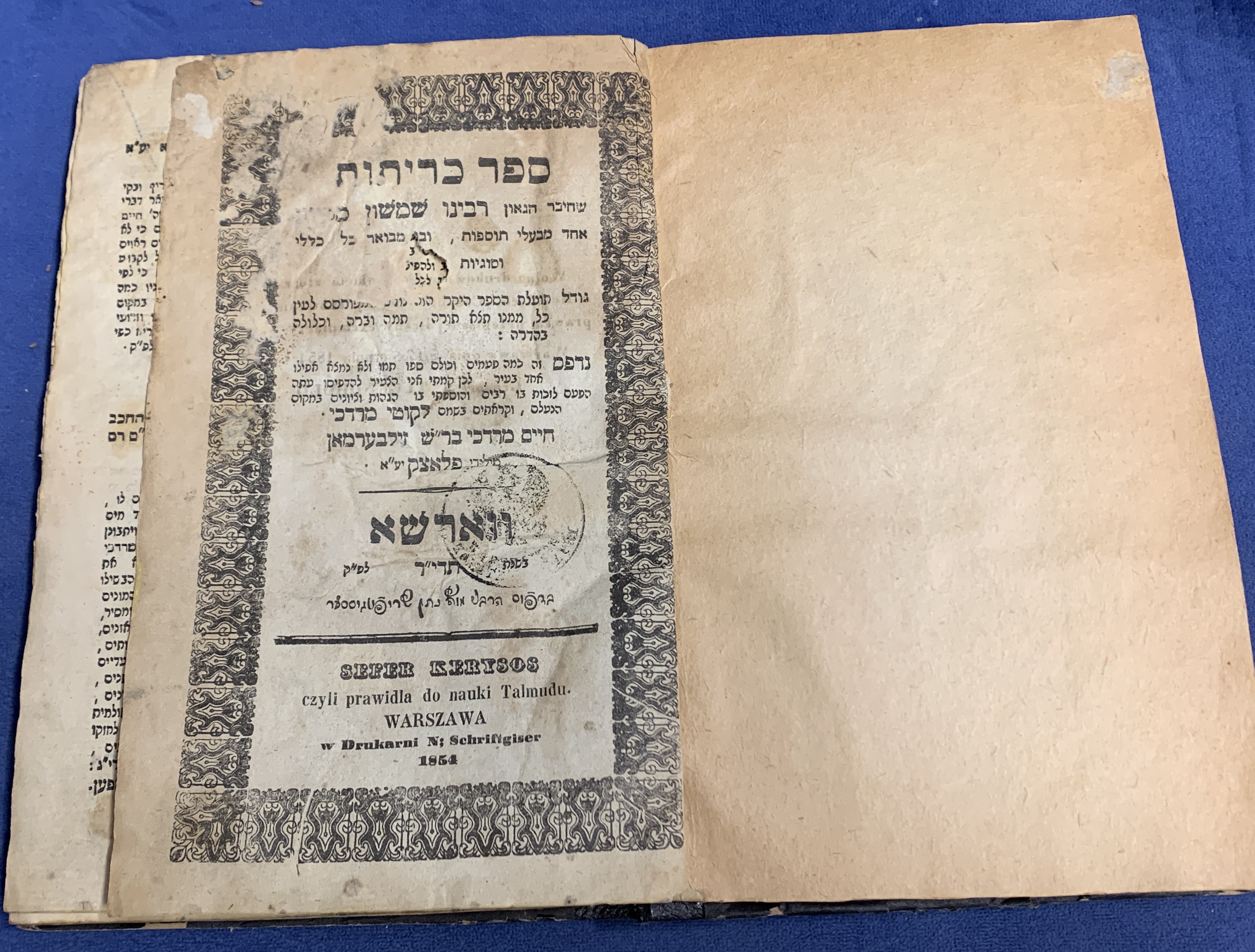 Lot 12: Sefer Keritut (Methodology of the Talmud) – R. Shimshon of Chinon – Warsaw, 1854 ספר כריתות לקוטי מרדכי- ווארשא, תרי"ד