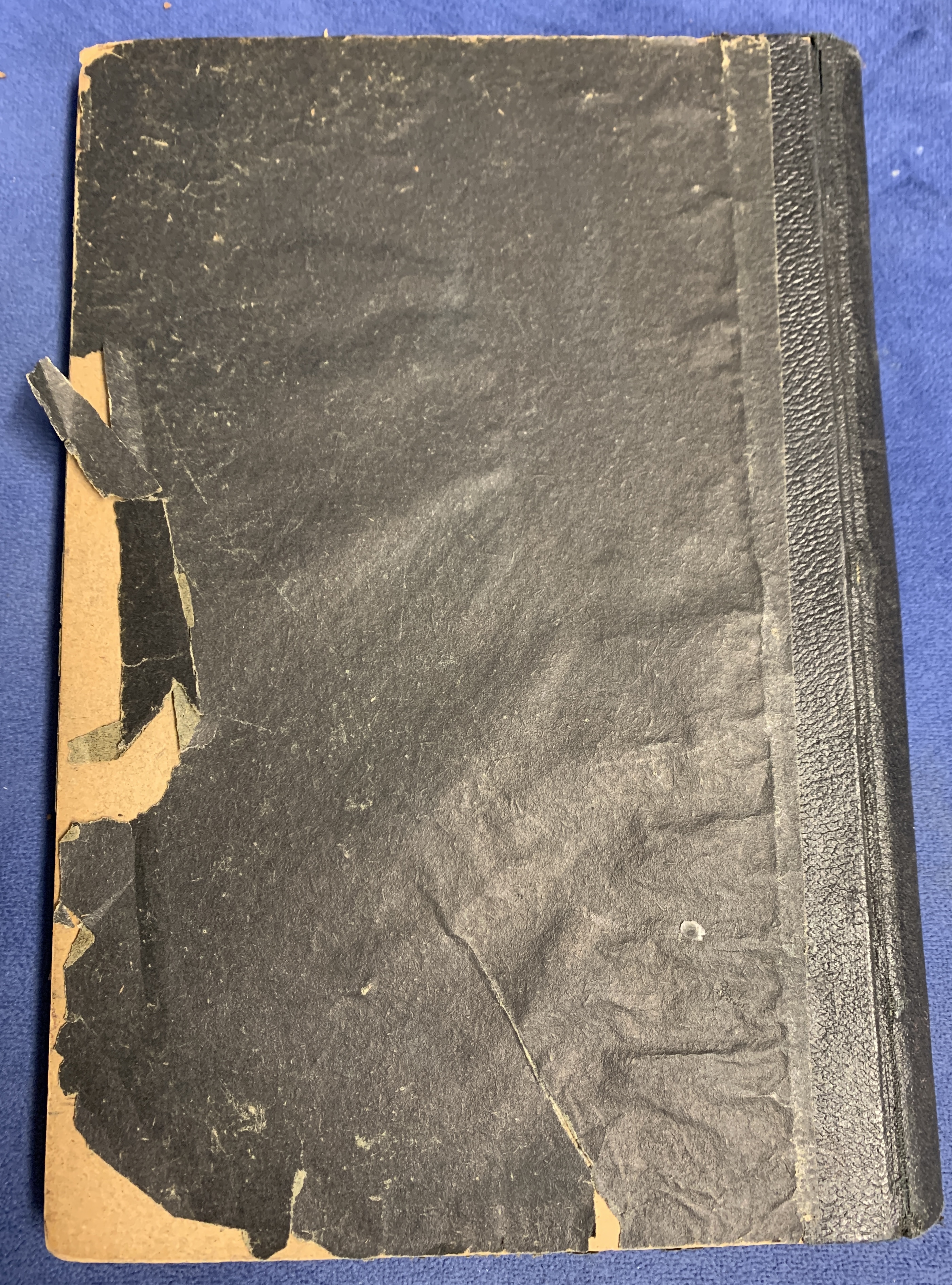Binding: The original boards are present but are heavily worn, peeling, and detached (spine is missing).