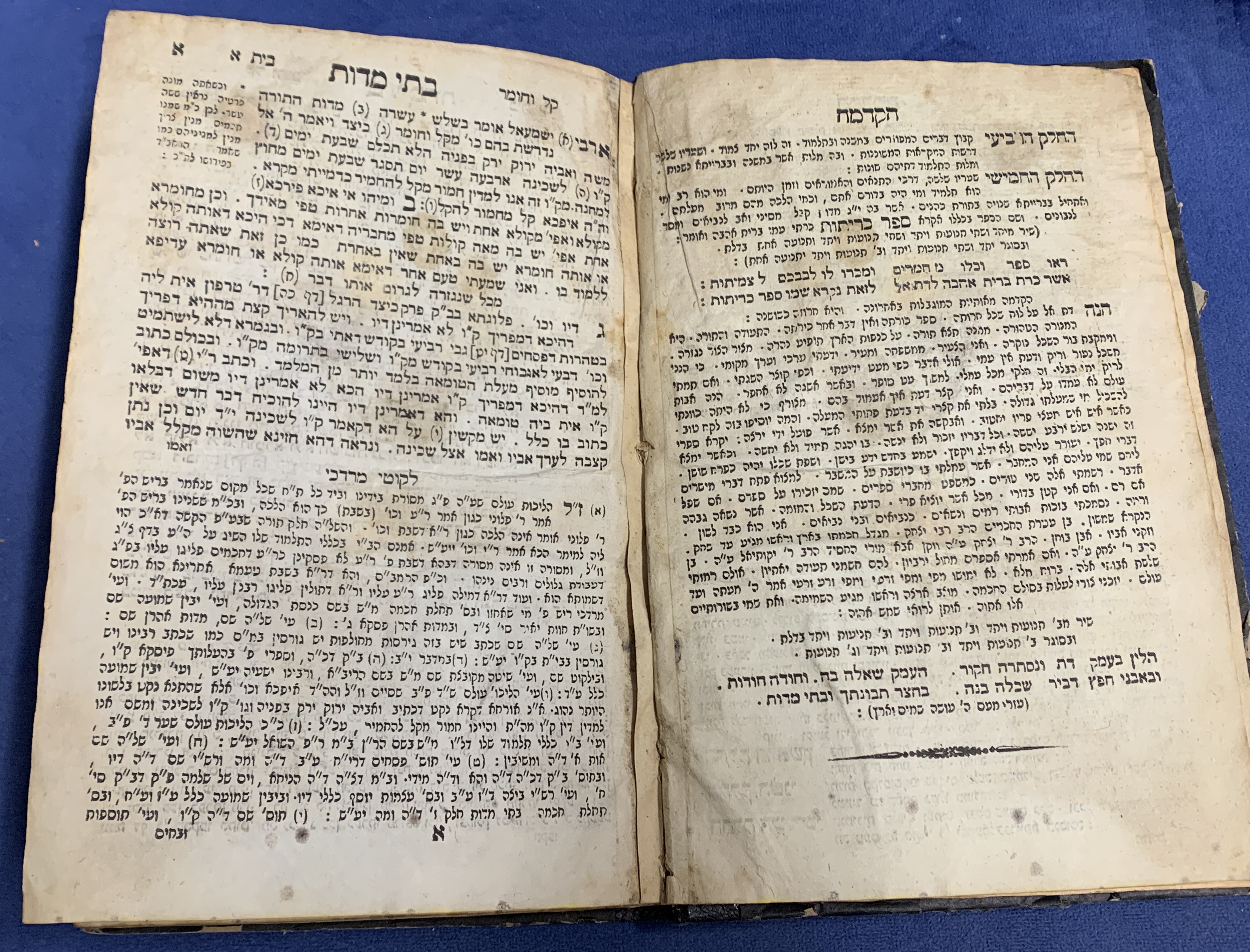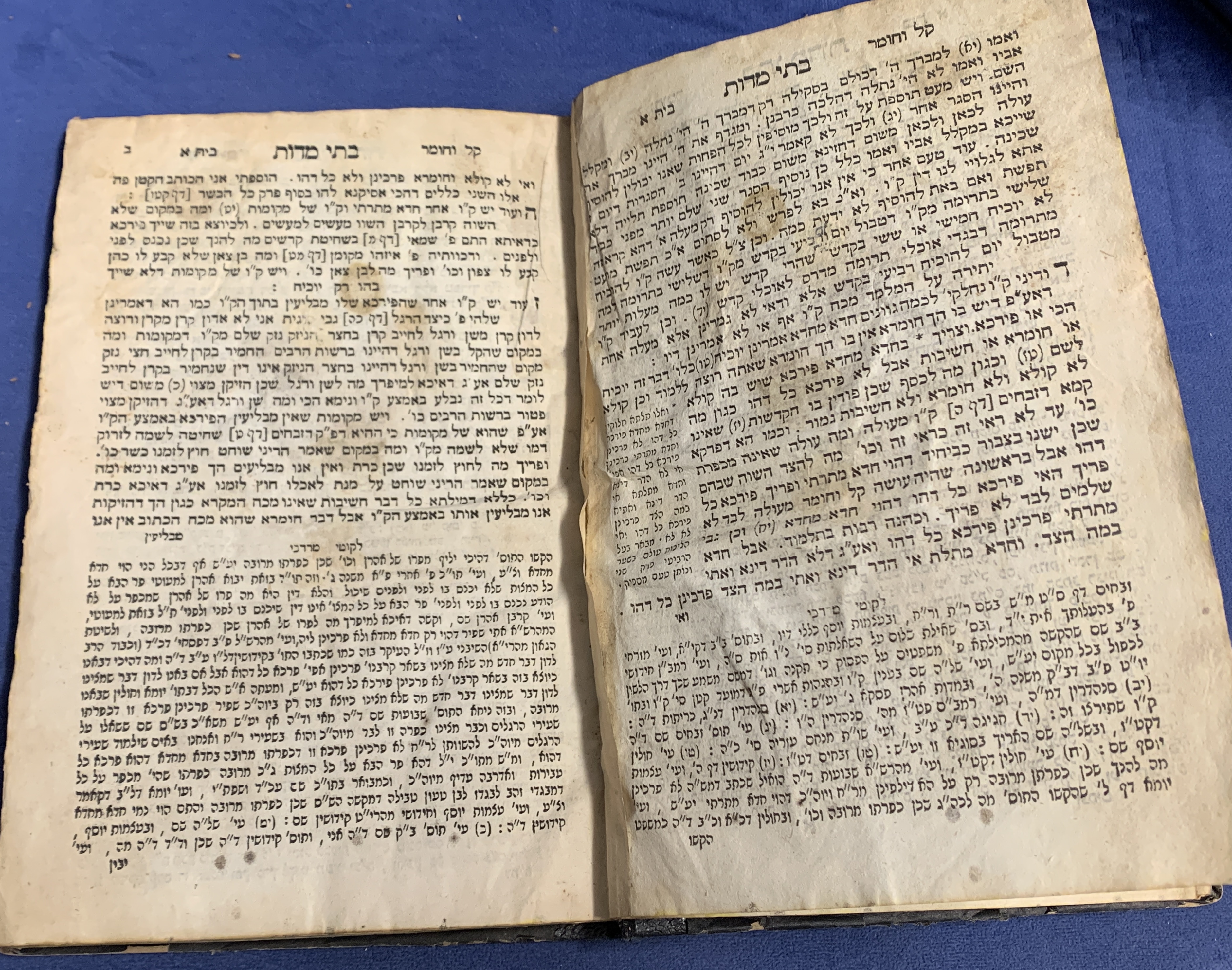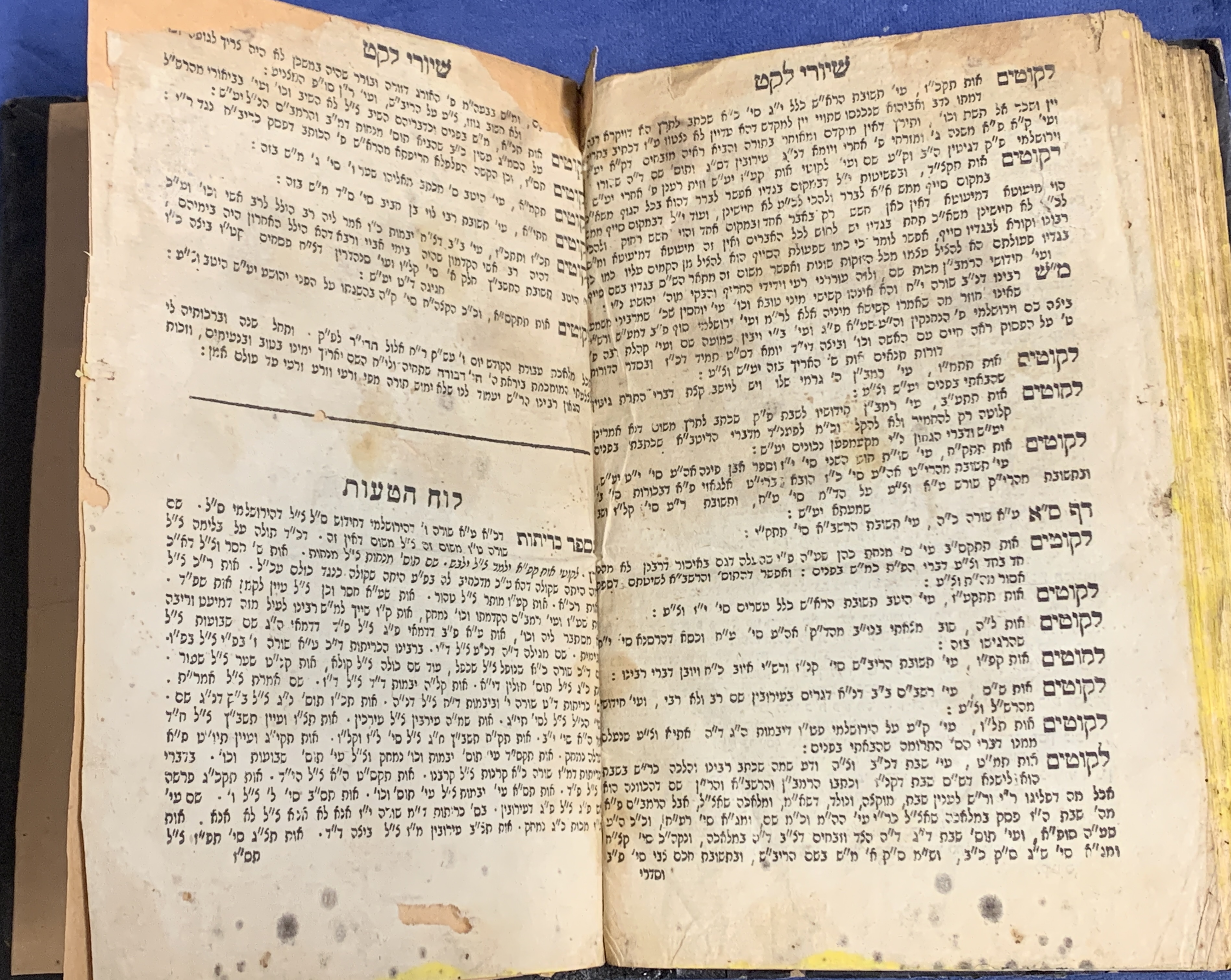 Pages: The title page shows significant wear, staining, and fraying at the edges. The internal pages are textually complete but show aging, yellowing, and staining/foxing throughout.