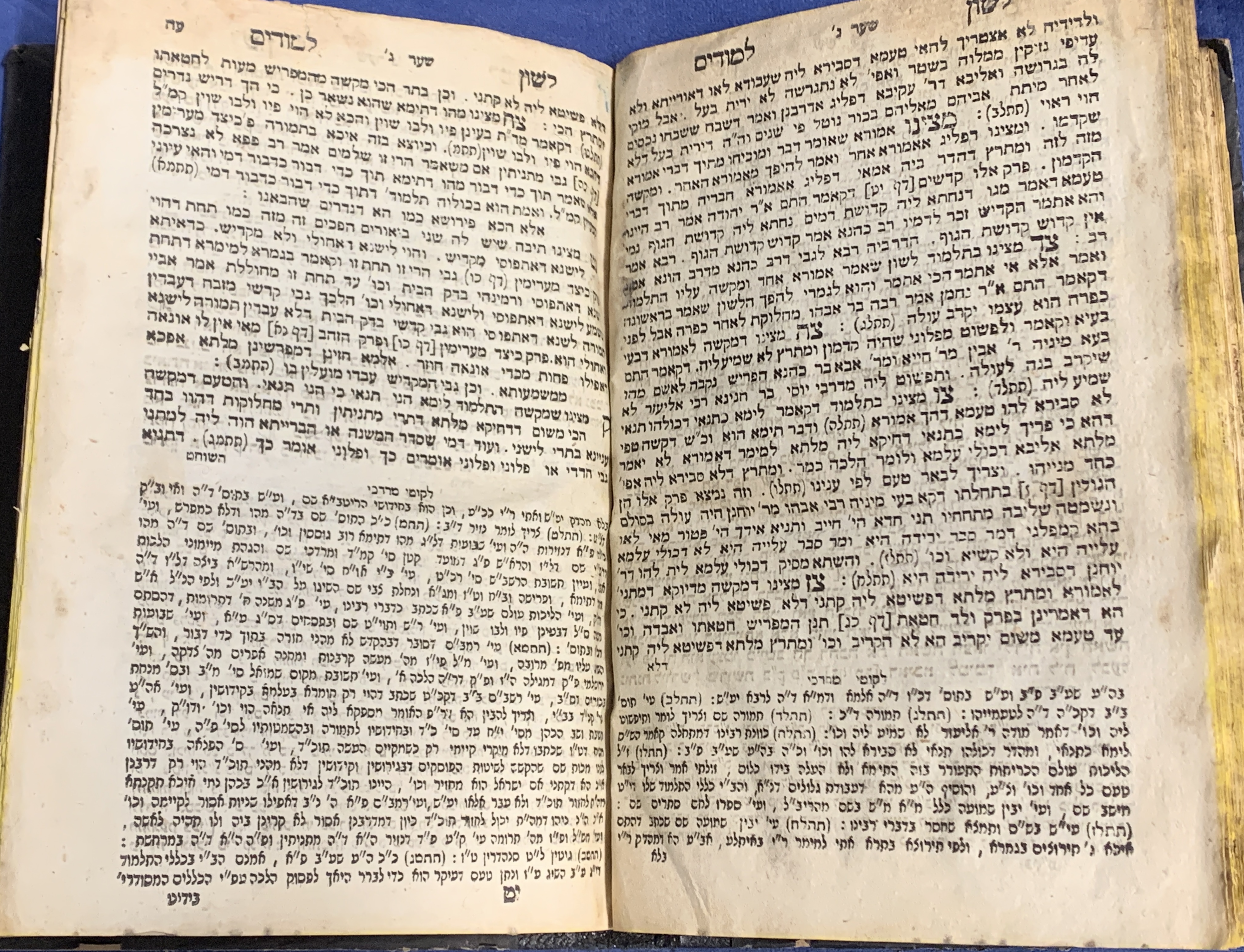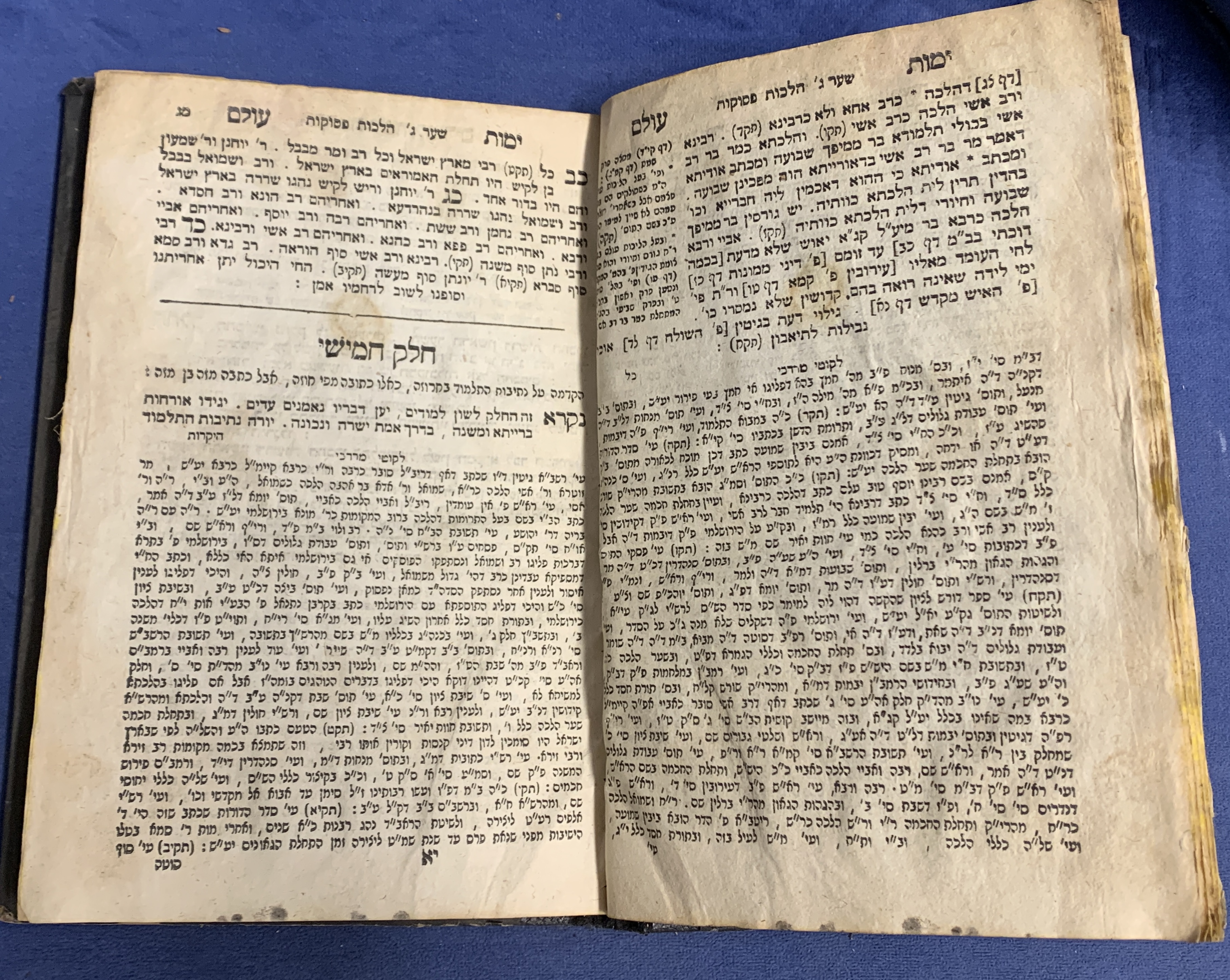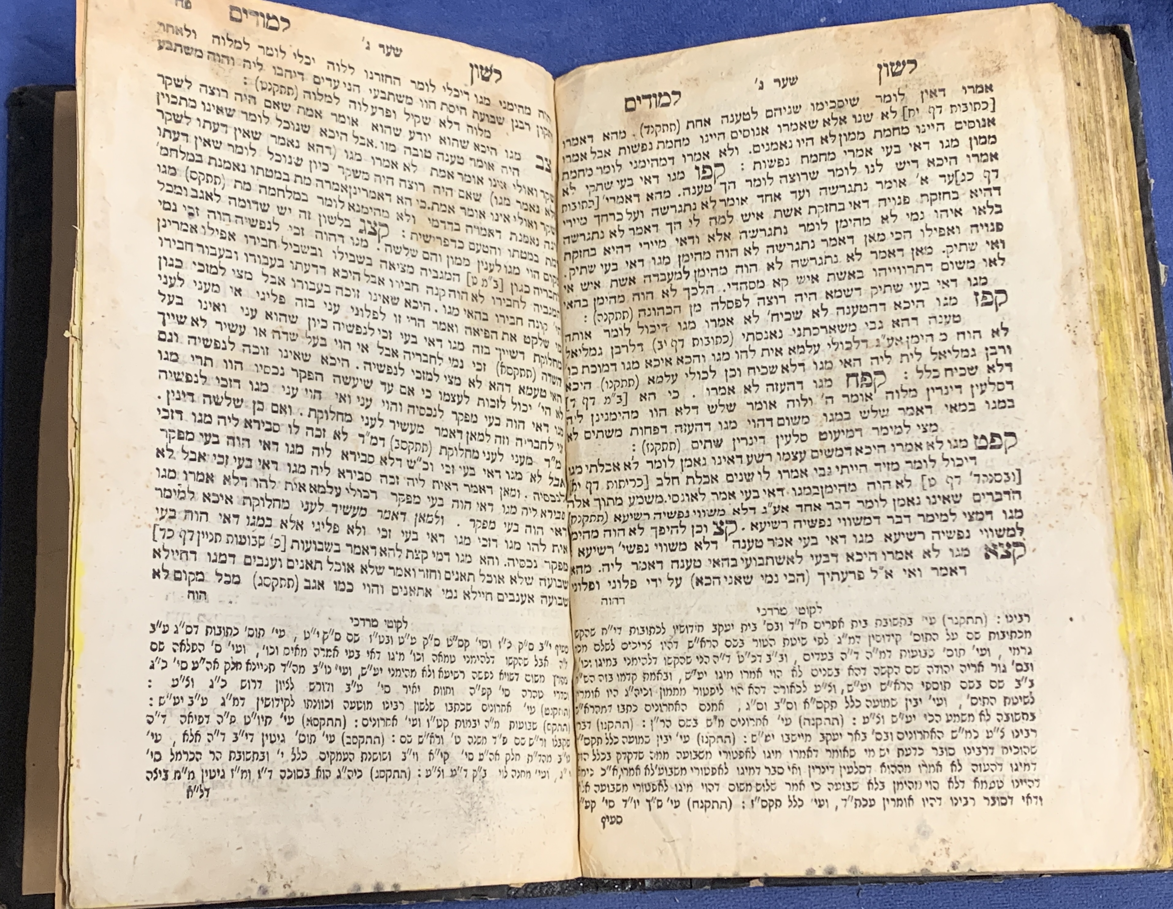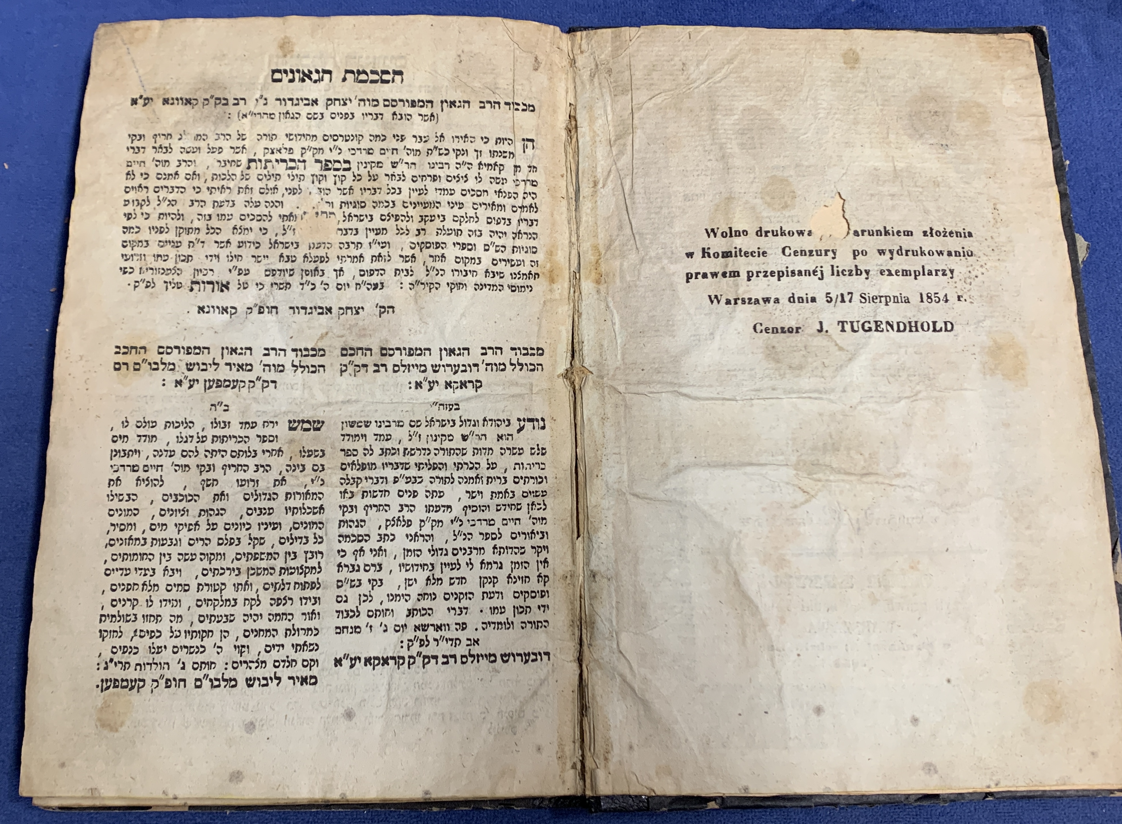 Pages: The title page shows significant wear, staining, and fraying at the edges. The internal pages are textually complete but show aging, yellowing, and staining/foxing throughout.