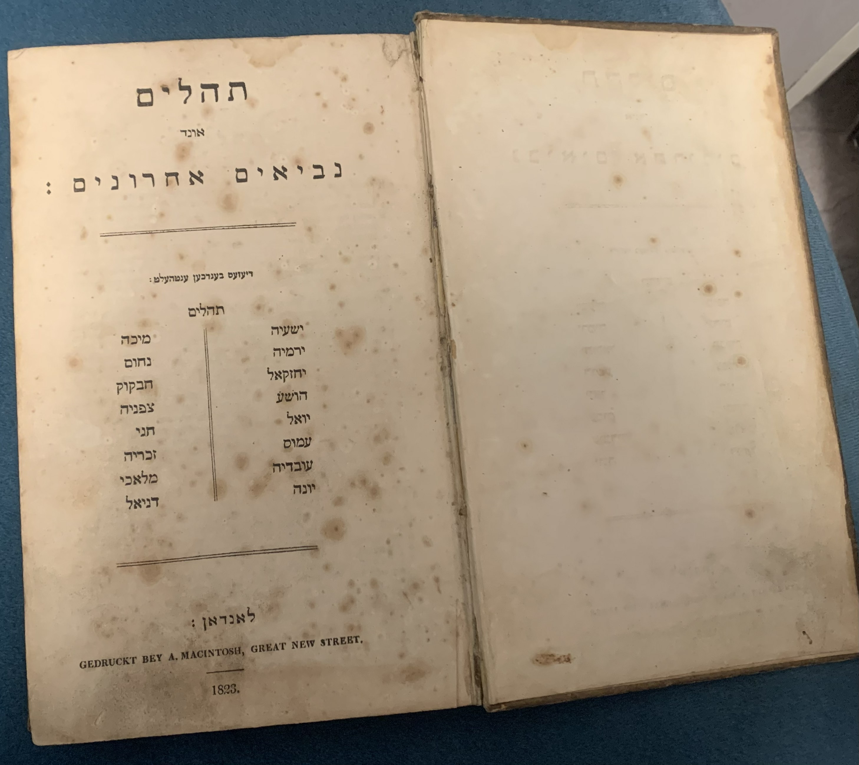 A historic 19th-century volume printed in London, featuring the full text of Psalms and the Latter Prophets, uniquely rendered in Yiddish and Rashi Script.