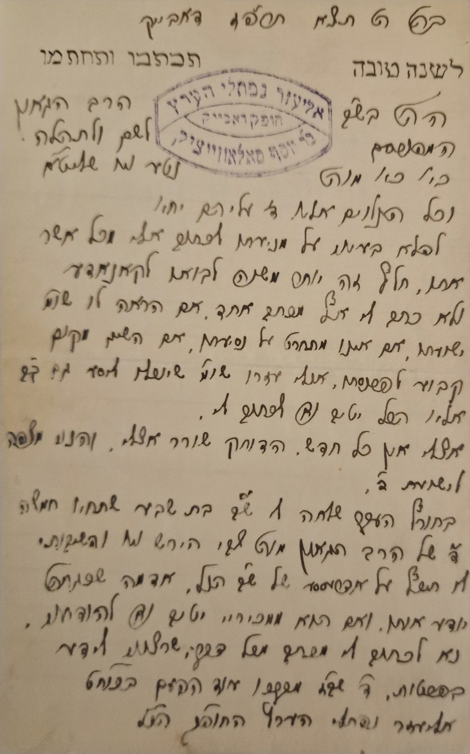 Handwritten Happy New year letter from Rabbi Eliezer Naftali Hertz Soloveitchik. 1917.