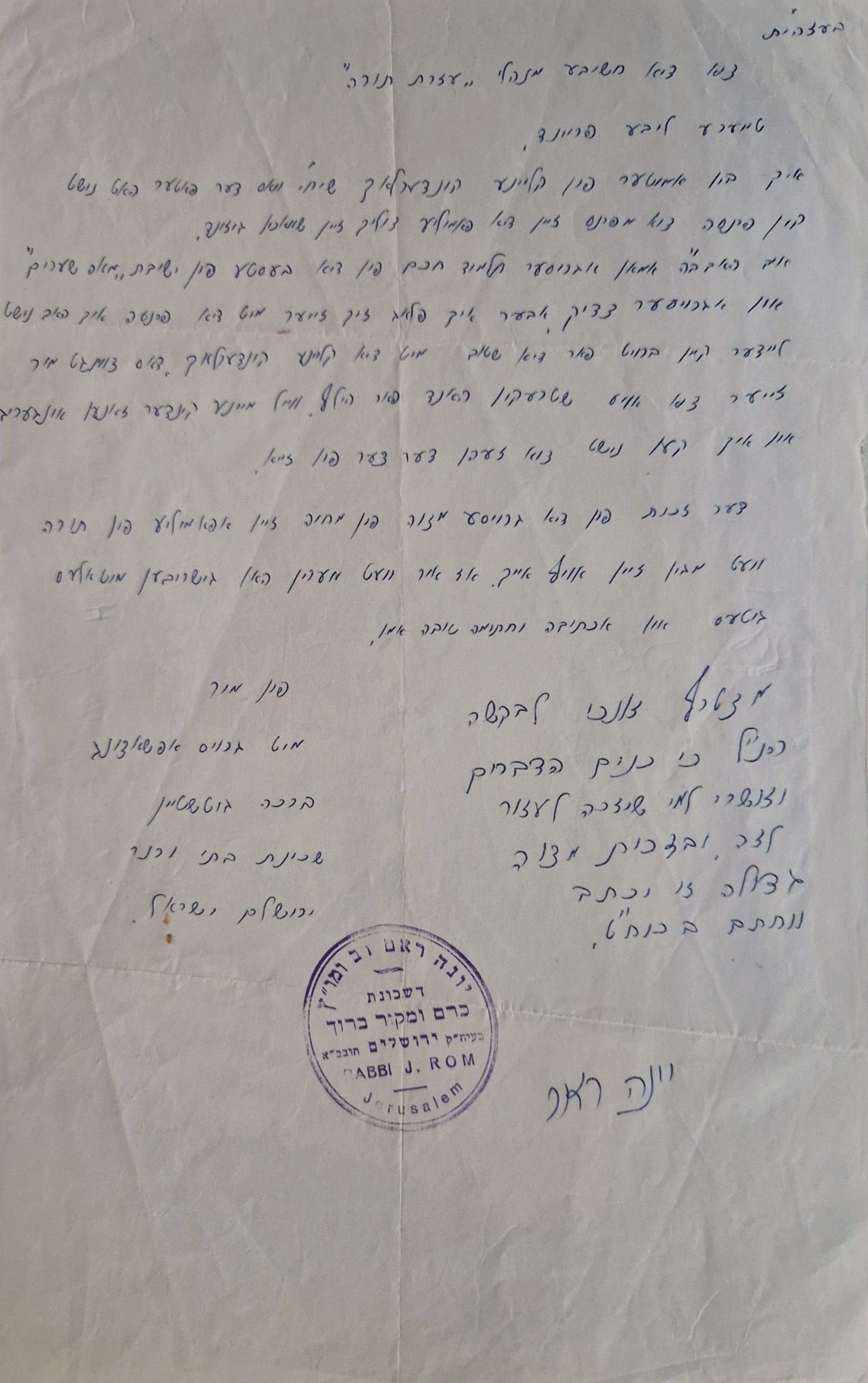 Letter asking the organisation Ezrat Torah to help financially and Rabbi Rom adds a few words of recommendation