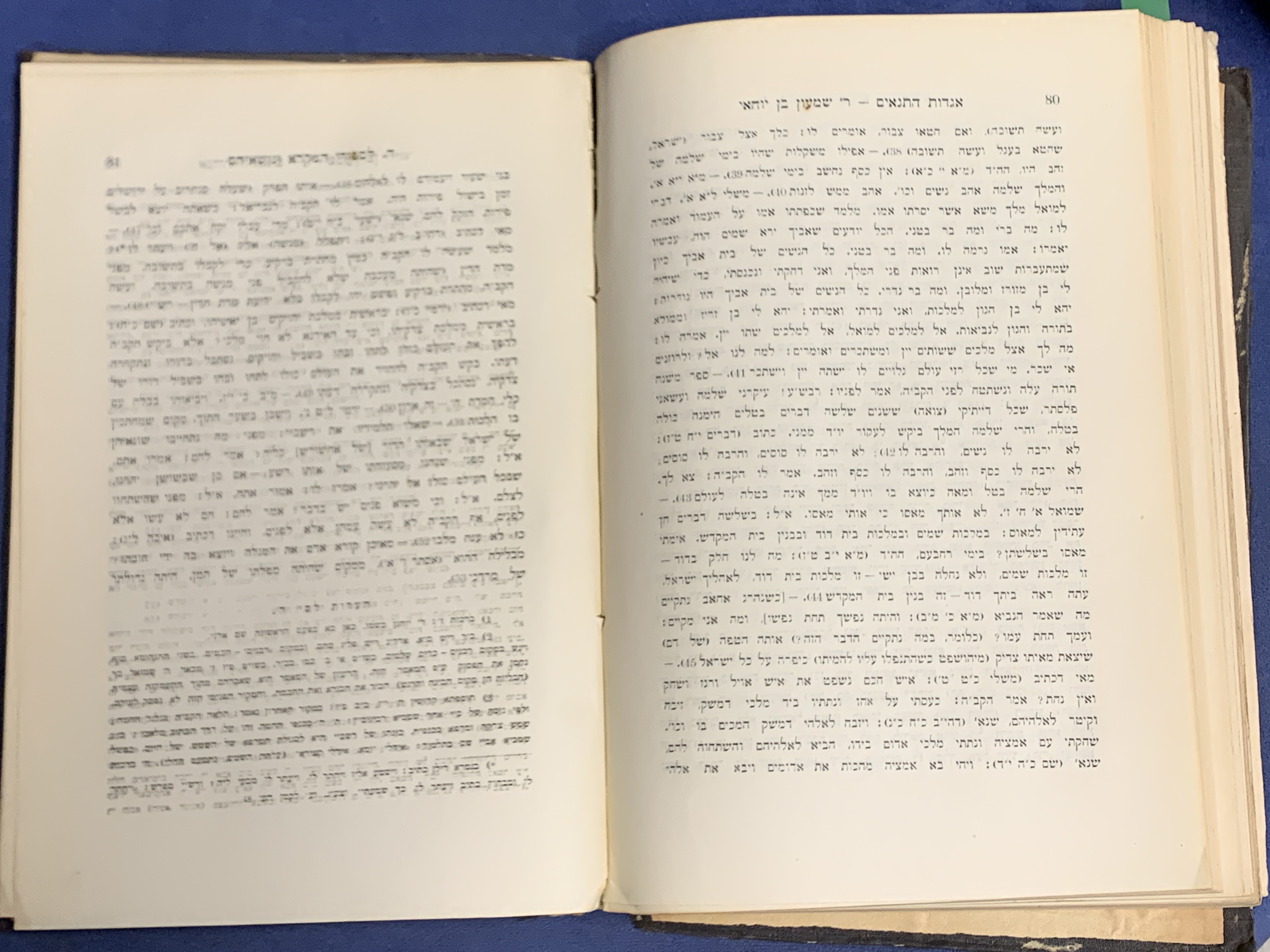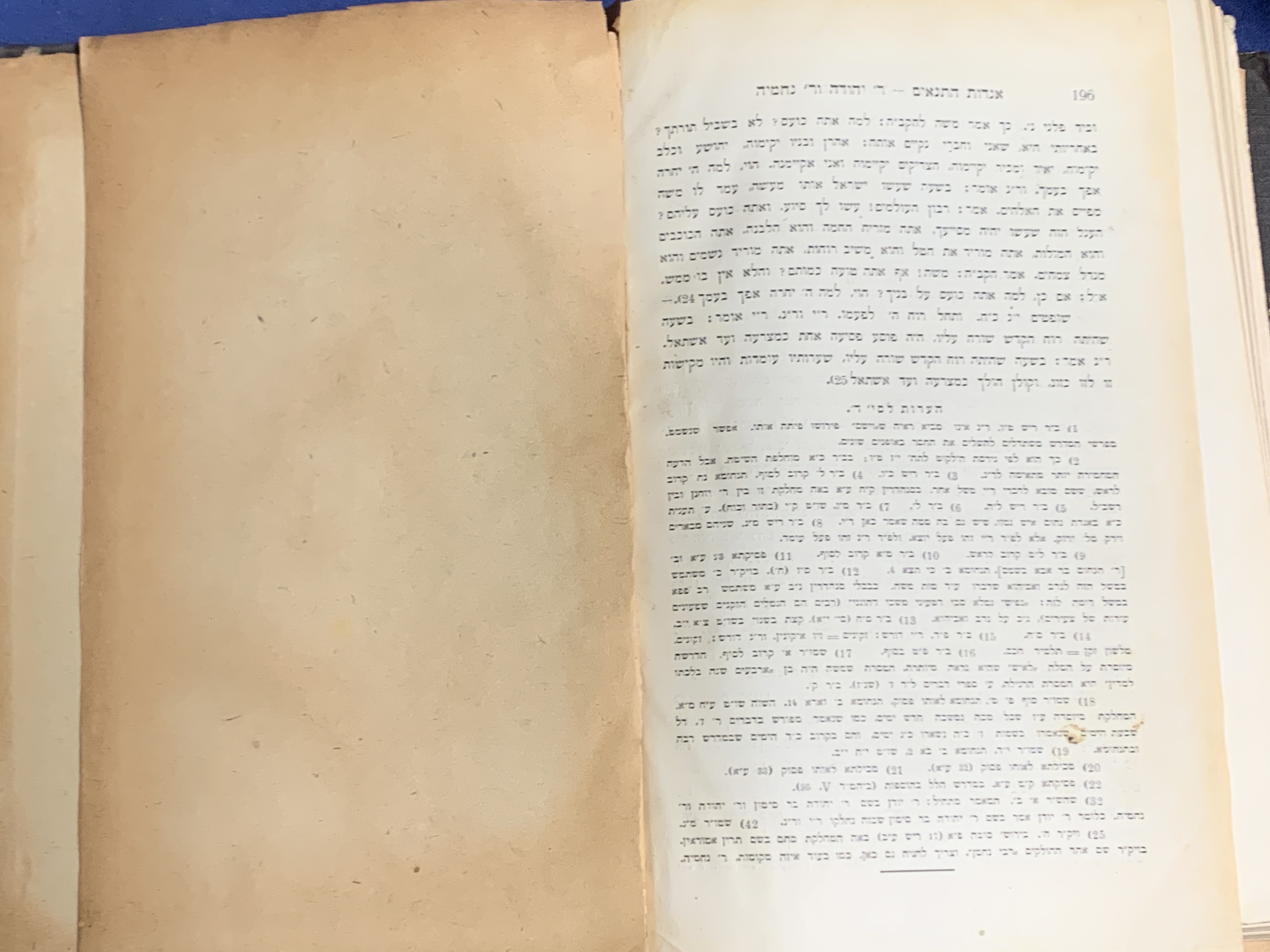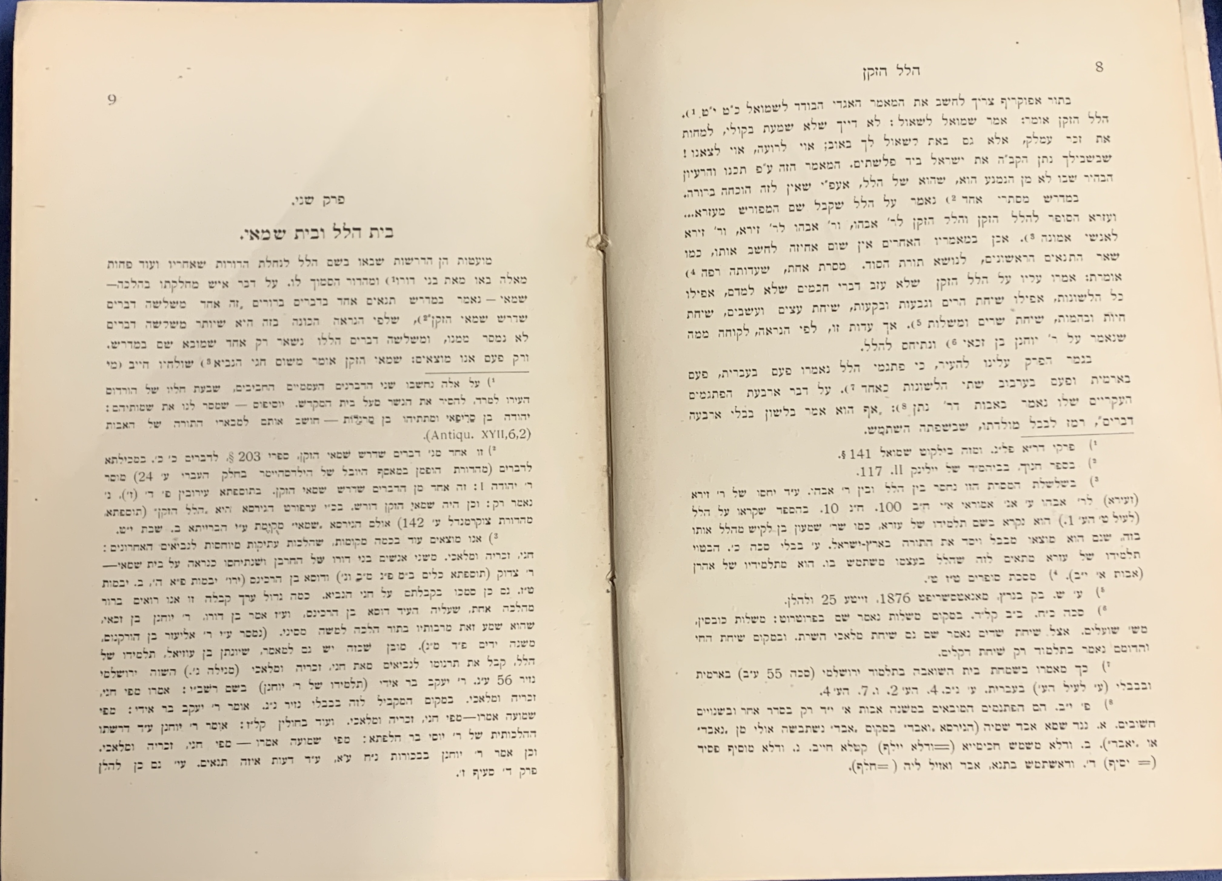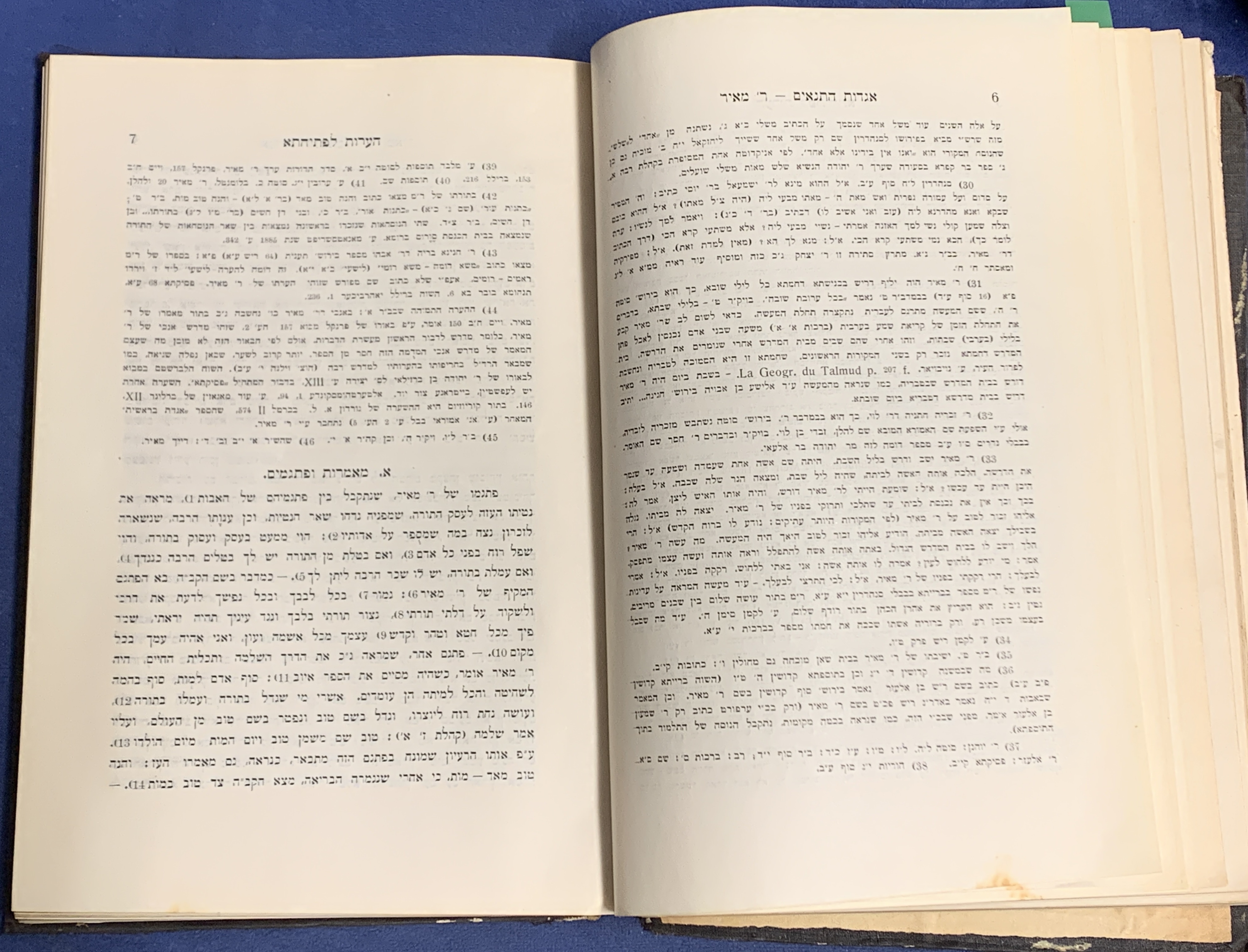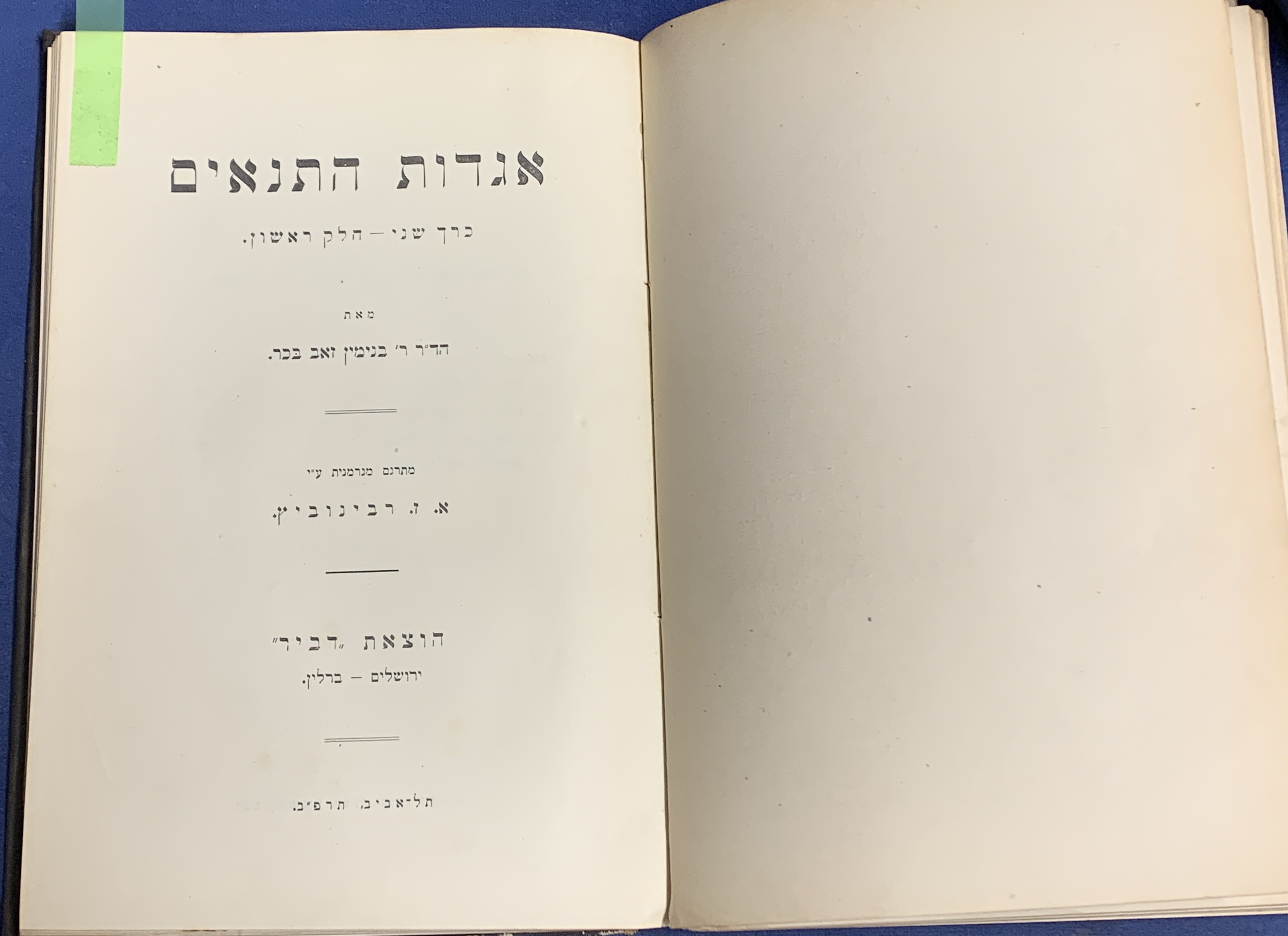 Description: This lot features a significant scholarly volume containing both parts of the first volume of Wilhelm Bacher’s Agadot HaTannaim (אגדות התנאים) bound together. Each part retains its own internal title page.