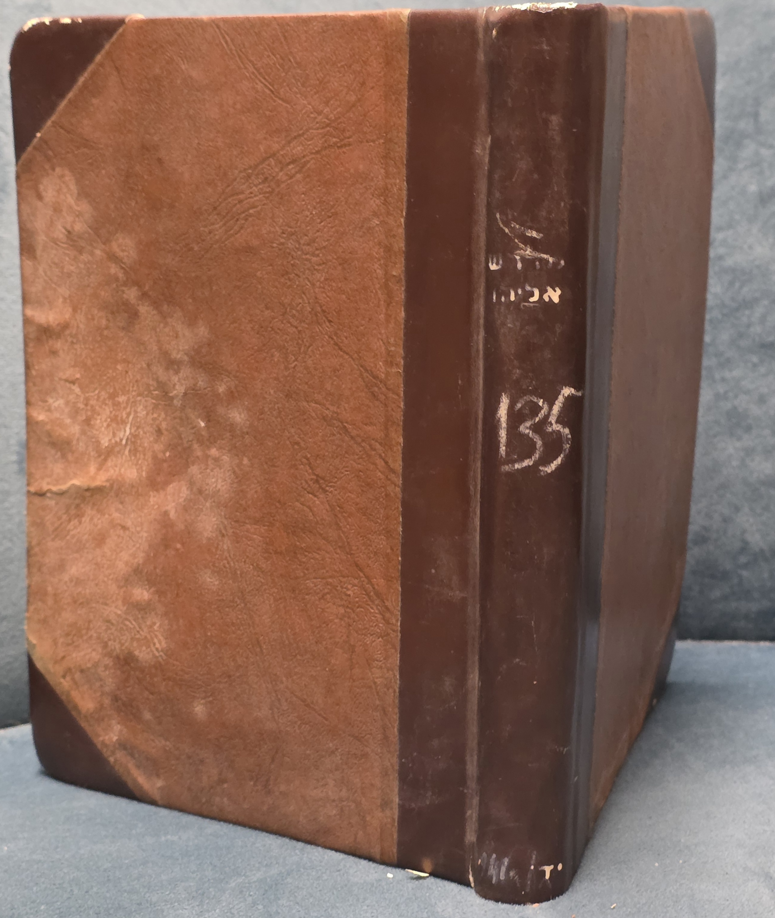 A significant Kabbalistic work featuring mystical commentaries and insights into the Tanakh and other sacred subjects. This edition was printed in Livorno (ליוורנו) in 1862 (תרכ"ב) by the renowned Elijah Ben Amozeg and Partners (אליהו בן אמוזג וחביריו) press. The volume includes the original errata sheet (לוח הטעויות) at the rear. It is housed in a period half-leather binding, featuring the inventory number "135" and hand-painted or stamped white identification text on the spine. This title has an established auction history, having been sold in March 2003 for $140.